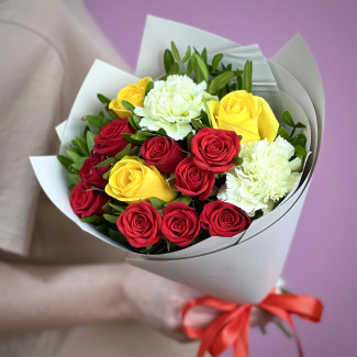 Хотите порадовать любимую и к завтраку сделать приятный сюрприз – букет Страстное утро идеально подойдет для этого. В композиции 3 розы, 2 гвоздики, 3 кустовые розы и салал. Букет очень яркий – красные, белые и желтые цветы не нуждаются в яркой упаковке, поэтому флористы сделали спокойное оформление из крафтовой бумаги.